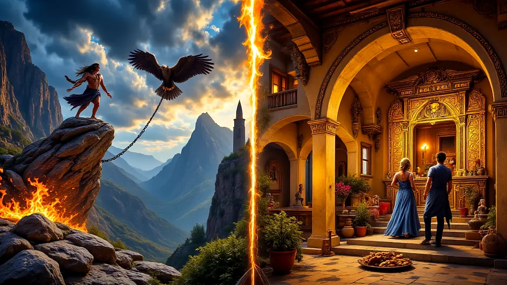 Greek creation myths involved gods fighting for power, with permanent results. The story of Prometheus involves stealing fire from the gods. Zeus punished him by chaining him to a rock. Humans received Pandora’s box, which released evils but kept hope inside. These myths served a purpose, explaining both human suffering and why hope remains. In contrast, Roman beliefs focused on everyday activities.